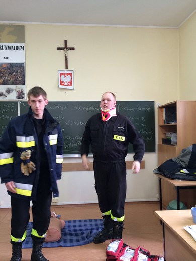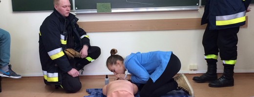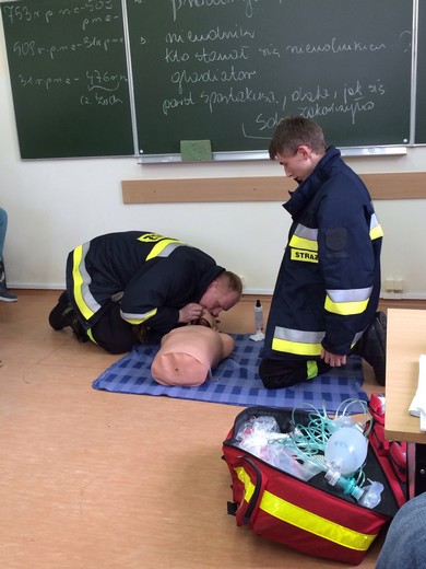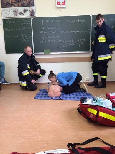 GOŁDAP. Na początku lekcji strażacy opisali zasady postępowania podczas udzielania pomocy osobom nieprzytomnym. Szczegółowo opowiedzieli nam o każdym kroku postępowania i ostrzegli przed ewentualnym niebezpieczeństwem podczas ratowania życia. Na fantomie pokazali poprawne wykonanie resuscytacji krążeniowo-oddechowej dla człowieka dorosłego i noworodka. Mieliśmy okazję zobaczyć specjalistyczny sprzęt służb ratunkowych, który ułatwia wszelkie próby ocalenia ludzkiego życia, np. maski tlenowe, szyny, czy koc termiczny. Strażacy nauczyli nas jak prawidłowo wezwać pomoc telefonicznie lub jak ułożyć w bezpiecznej pozycji poszkodowaną osobę. Ratownicy udzielili nam również odpowiedzi na wszystkie nurtujące nas pytania.