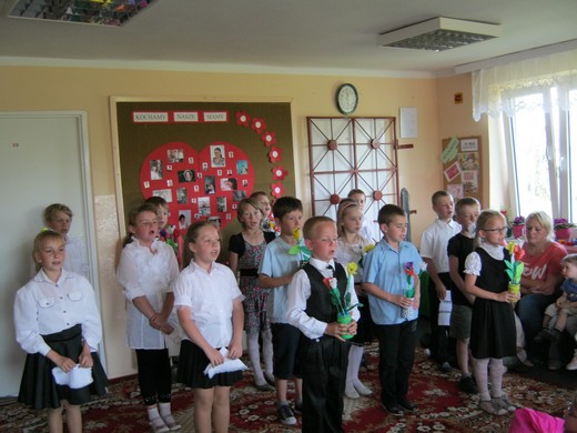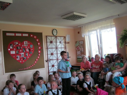 Uroczystość rozpoczęła się częścią artystyczną przygotowaną przez poszczególne klasy pod opieką swoich wychowawców. Uczniowie poprzez wiersze i piosenki wyrazili swoją miłość i wdzięczność za matczyną dobroć i serce oraz złożyli życzenia. Nie zabrakło tradycyjnego "Sto lat" i własnoręcznie wykonanych upominków. Wszystkie mamy były zachwycone występami swoich dzieci. Były dumne ze swoich pociech. Występujące dzieci wzbudziły wśród nich duże wzruszenie i emocje. Jeszcze raz życzymy wszystkim mamom dużo szczęścia, zdrowia oraz zadowolenia ze swych pociech.