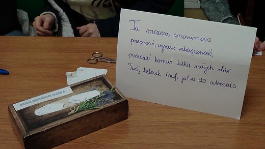 GOŁDAP. 15 grudnia w gołdapskim gimnazjum obchodzono Dzień Dobrego Słowa. To inicjatywa, która ma pomóc czynić świat lepszym, piękniejszym, szczęśliwszym. Gimnazjaliści pod kierunkiem Anety Wojnar-Konopki propagowali wspólną pracę nad właściwym stosunkiem do słowa. Zachęcali do używania słów miłych, przyjaznych, a zrezygnowania z takich, które sprawiają innym przykrość lub obrażają. Proponowali wspieranie innych, pomaganie im, podtrzymywanie na duchu, „sianie dobrych emocji i energii". Zapoznawali rówieśników z ideą akcji dzięki przygotowanej gazetce. Zawiesili w pokoju nauczycielskim oraz na korytarzach zestawy pokrzepiających zdań, a następnie zachęcali do ich odrywania i przekazania następnym osobom. Stworzyli katalog chwytliwych haseł promujących dbałość o słowo. Przygotowali również skrzynkę dobrych słów i proponowali skorzystanie z możliwości anonimowego przeproszenia, wyrażenia wdzięczności, przekazania miłych słów listownie przy stoisku obok biblioteki. Inicjatywa spotkała się z akceptacją i spontaniczną reakcją społeczności szkolnej, co napawa organizatorów optymizmem w myśl zasady „kropla drąży kamień".