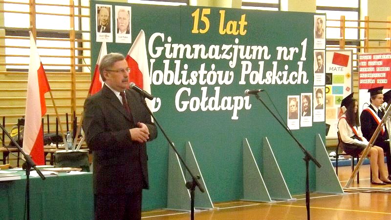 GOŁDAP. Gimnazjum nr 1 im. Noblistów Polskich w Gołdapi ma już 15 lat. Obchody rocznicy odbyły się w miniony piątek przed południem. Dyrektor szkoły Bożena Kalinowska powitała gości, wśród których znaleźli się m.in.: wojewoda warmińsko-mazurski Marian Podziewski, burmistrz Gołdapi Tomasz Luto, przedstawicielka ełskiej delegatury Kuratorium Oświaty Anna Krysztopa, wiceburmistrz Gołdapi Jacek Morzy,starosta gołdapski Andrzej Ciołek, proboszcz parafii św. Leona i Bonifacego ks. Czesław Król, radni meijscy: Andrzej Pianka, Zofia Syperek, Jan Steć, Zdzisław Janczuk, Marian Mioduszewski, Janina Pietrewicz, Piotr Wasilewski, Józef Wawrzyn, Stanisław Wójtowicz, poprzedni dyrektorzy Mirosław Sidor i Romulus Germaniuk, członkowie rady rodziców: Małgorzata Kisłowska, Małgorzata Kamińska, Anna Buczyńska, Edyta Lampart-Symko, prezes ZKiBWP Mieczysław Sztabiński, dyrektor SP2 Stefan Piech, dyrektor SP3 Leszek Retel, wicedyrektor SP1 Lila Romaniuk, wicedyrektor ZSZ Alicja Szafranowska, dyrektor SOSW Anna Kuskowska, dyrektor Powiatowej Stacji Sanitarno-Epidemiologicznej Halina Karińska, inspektor PSSE Ewa Bolewska, zastępca komendanta hufca ZHP Urszula Wrzosek i przedstawicielka OSiR Anna Biedrzycka.