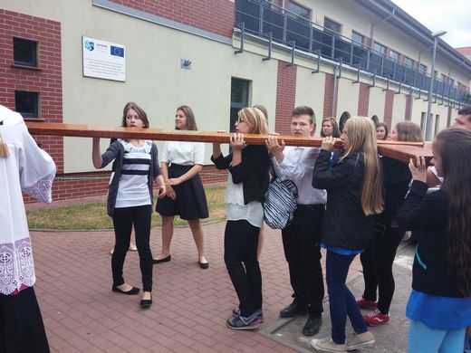 GOŁDAP. 19 czerwca społeczność Gimnazjum nr 1 im. Noblistów Polskich w Gołdapi miała niecodzienną okazję gościć w progach szkoły peregrynujące symbole Światowych Dni Młodzieży – ikonę Matki Bożej i krzyż. Na początku dyrektor i uczniowie gimnazjum powitali przybyłe symbole, a następnie odśpiewano hymn ŚDM. Panie katechetki przygotowały uroczysty montaż słowno-muzyczny, a o oprawę muzyczną zadbała nauczycielka muzyki Patrycja Magielnicka. Gimnazjaliści przedstawili zgromadzonym najważniejsze informacje dotyczące historii i tematyki spotkań młodzieży z kolejnymi papieżami, cytując znaczące wypowiedzi Jana Pawła II, Benedykta XVI i Franciszka oraz dokonując ich wyjaśnienia. W podniosły nastrój wprowadziły nas śpiewane przez uczennice pieśni.