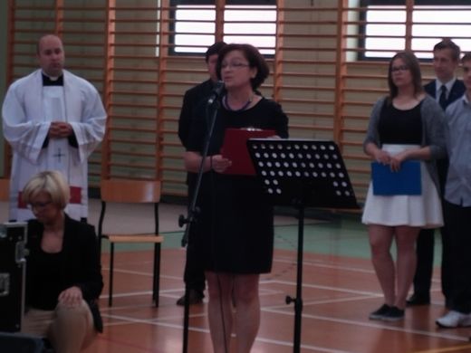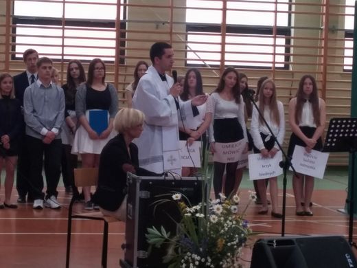 Następnie głos zabrał ks. Czesław Król, który krótko opowiedział o własnych doświadczeniach z uczestnictwa w Światowych Dniach Młodzieży. Natomiast ks. Kamil Borys, jako koordynator ŚDM Dekanatu Gołdapskiego i Filipowskiego zachęcał gimnazjalistów do udziału w wolontariacie i wspierania organizacji ŚDM, które odbędą się w Krakowie w 2016 roku.