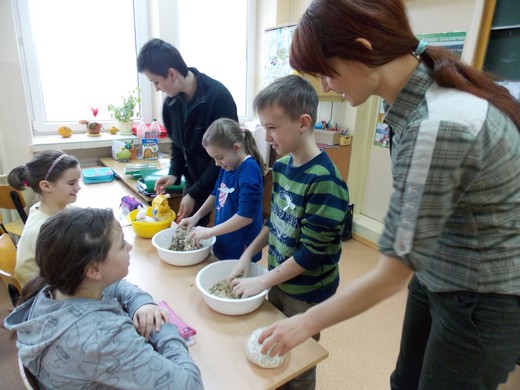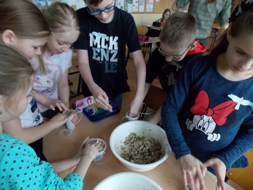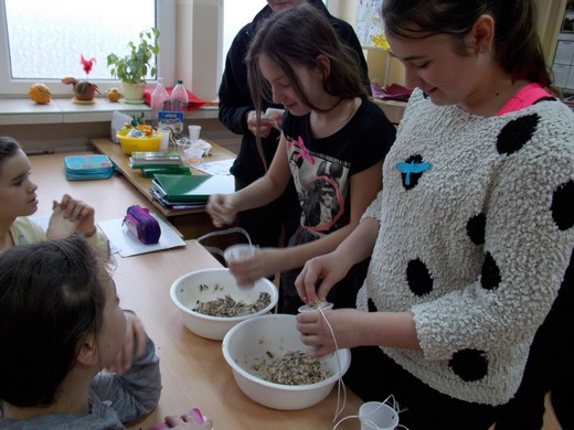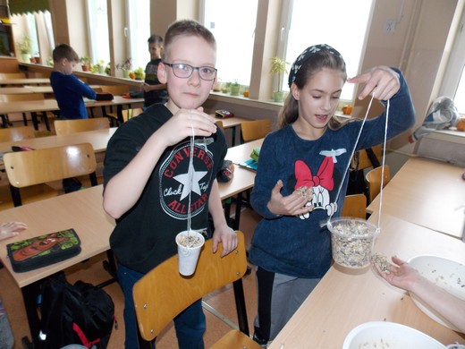 GOŁDAP. 19 lutego w Szkole Podstawowej nr 3 panie: Elżbieta Gumowska i Żaneta Golub z Parku Krajobrazowego Puszczy Rominckiej przeprowadziły warsztaty o zimujących ptakach. Zorganizowano je w ramach akcji „Zapełniamy puste brzuszki - szkolny karmnik”. Podczas zajęć dzieci dowiedziały się m.in. o tym, kiedy i czym należy karmić ptaki, gdzie i jak prawidłowo zainstalować karmnik, jak opiekować się taką stołówką oraz jakie gatunki ptaków można zaobserwować zimą. Uczniowie nauczyli się rozpoznawać te ptaki po charakterystycznych cechach ich wyglądu. Dużą atrakcją było przygotowywanie przez uczniów pokarmu dla ptaków. Tu panie pokazały możliwości wykorzystania odpadów (butelek PET, plastikowych opakowań). Mieszanką smalcu z różnorodnymi ziarnami zbóż, słonecznikiem, płatkami owsianymi dzieci napełniały plastikowe kubeczki po serkach czy jogurtach, by potem zawiesić je w przyszkolnym ogródku. Młodzi ludzie okazali duże zainteresowanie omawianą tematyką, o czym świadczy ich aktywność i zaangażowanie na zajęciach. Szkoła dziękuje Elżbiecie Gumowskiej i Żanecie Golub za bardzo atrakcyjne, pełne ciekawostek warsztaty.
