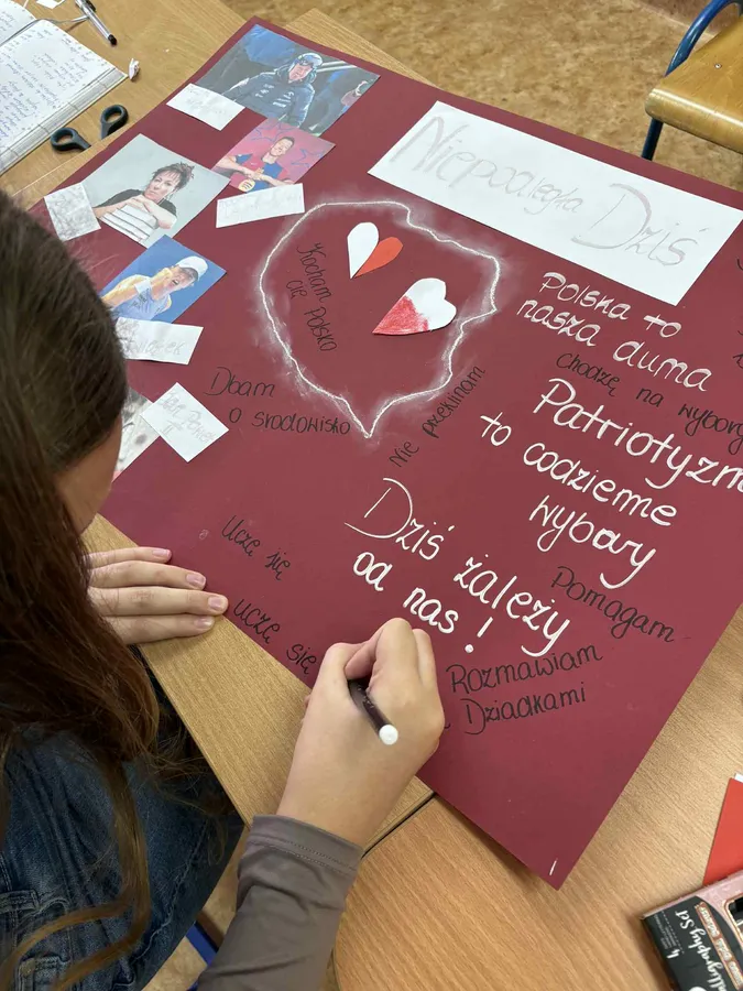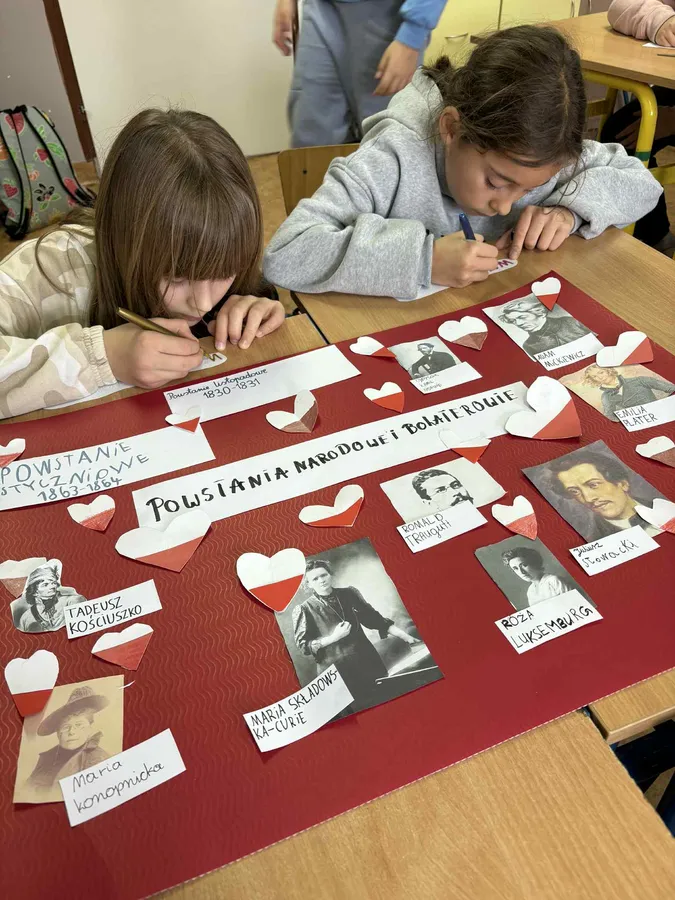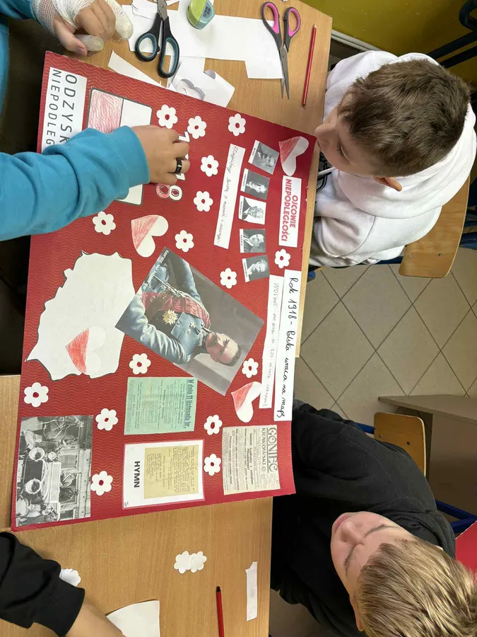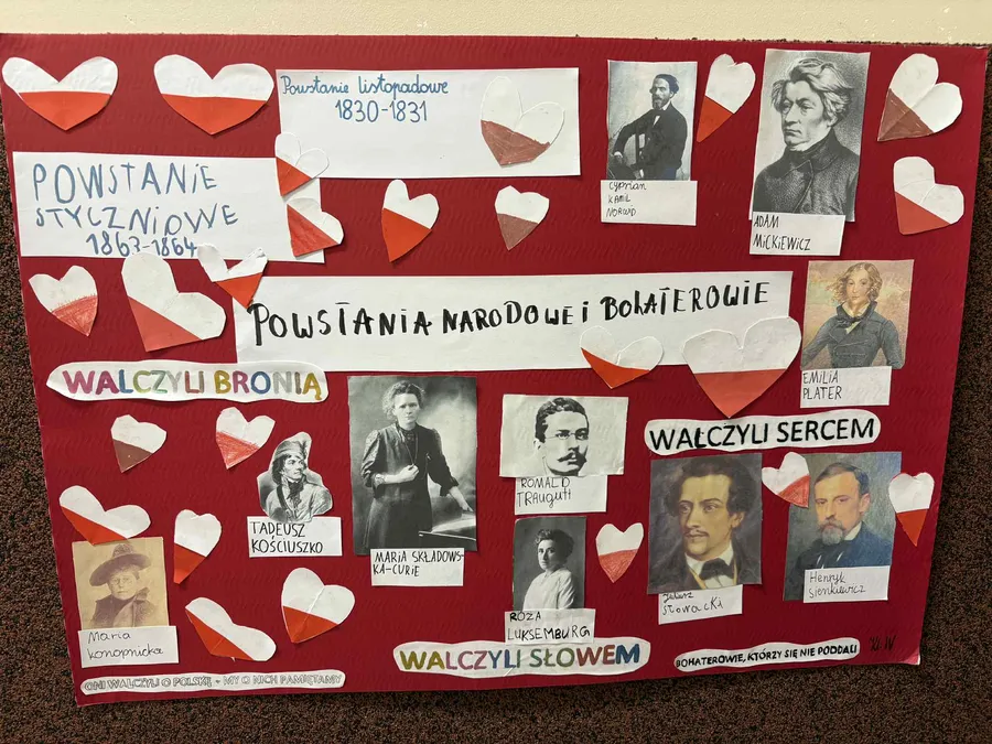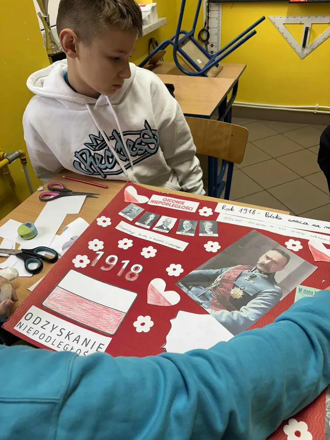 Każda klasa z ogromnym zaangażowaniem przedstawiła swój temat w formie plastycznej. Wspólna praca i rozmowy sprawiły, że mogliśmy poczuć dumę i wdzięczność z bycia Polakami. Efekty tych pięknych działań można podziwiać na dolnym holu szkoły. Zatrzymajcie się na chwilę - warto!