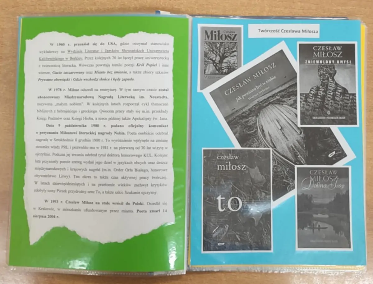 Podczas pracy nad albumami uczniowie korzystali z różnorodnych źródeł, wyszukiwali potrzebne informacje, analizowali wiersze i dobierali ilustracje podkreślające charakter twórczości Miłosza. Wielu z nich wzbogaciło swoje albumy o mapy miejsc związanych z poetą, cytaty z jego utworów, fotografie, a nawet własnoręcznie narysowane portrety pisarza. Gotowe prace zostały udostępnione w szkolnej bibliotece, dzięki czemu mogą z nich korzystać wszyscy uczniowie. To cenna pomoc dla tych, którzy chcą poszerzyć swoją wiedzę o laureacie Nagrody Nobla, przygotować się do konkursów, lekcji języka polskiego czy projektów humanistycznych. Albumy niewątpliwie stanowią atrakcyjne źródło wiedzy i przykład zaangażowania uczniów w poznawanie polskiej literatury.