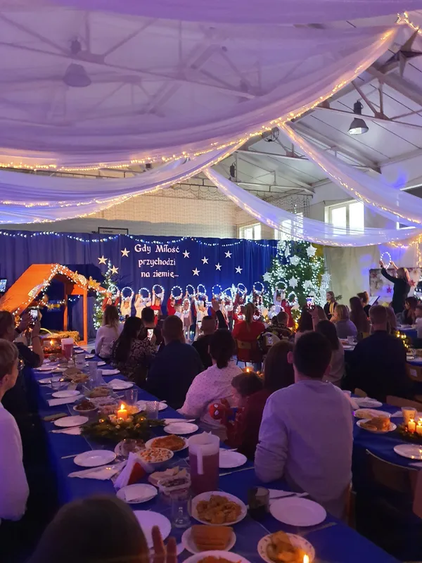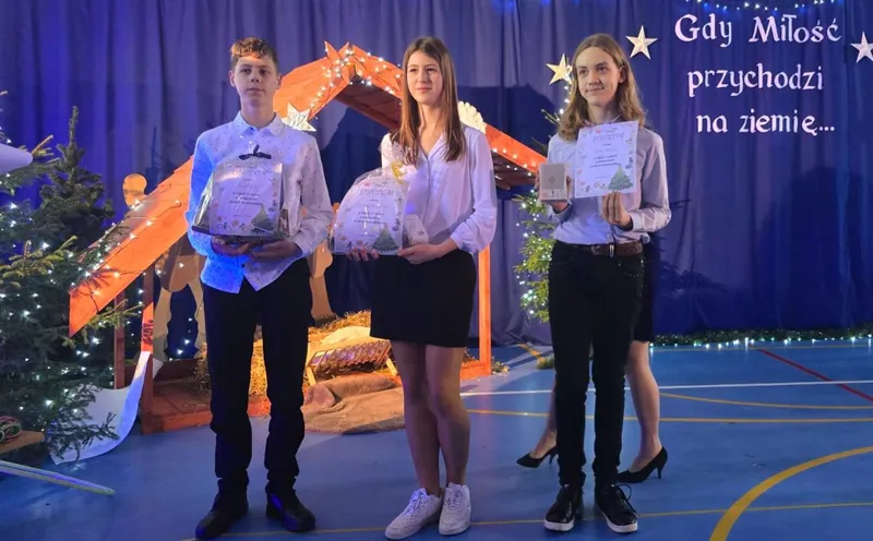 Kolejnym punktem programu było wręczenie nagród w dwóch szkolnych konkursach: na gwiazdkę betlejemską oraz na stroik świąteczny. Prace uczniów zachwycały pomysłowością i są pięknym świadectwem pielęgnowania polskich tradycji bożonarodzeniowych. Uroczystość zakończyła się wspólną modlitwą, dzieleniem się opłatkiem oraz szkolną wigilią.
