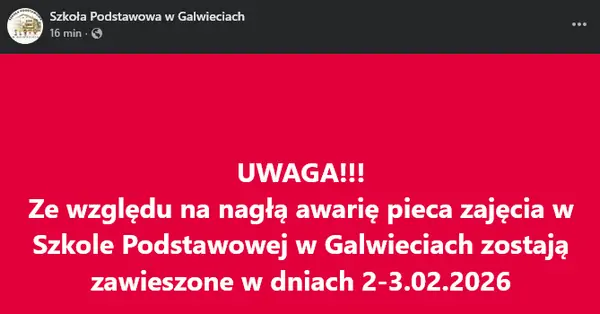 Dyrektor Szkoły Podstawowej w Galwieciach zawiesza zajęcia z powodu awarii pieca.