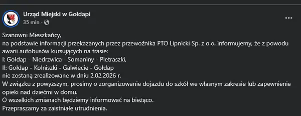 Około godziny 21 na profilu Urzędu Miejskiego w Gołdapi pojawił się informacja o awarii autobusów kursujących na dwóch liniach dowożących uczniów do szkół. Urząd prosi rodziców o organizowanie transportu dzieci we własnym zakresie.