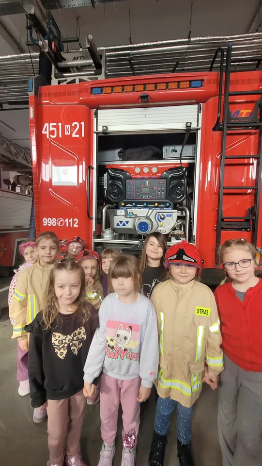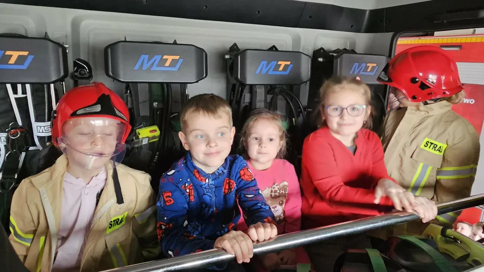 Kolejnym punktem wizyty było zwiedzanie komendy. Dzieci mogły z bliska obejrzeć wozy strażackie oraz sprzęt wykorzystywany podczas akcji ratowniczych. Największą radość sprawiła im możliwość wejścia do środka wozu i poczucia się przez chwilę jak prawdziwi strażacy.