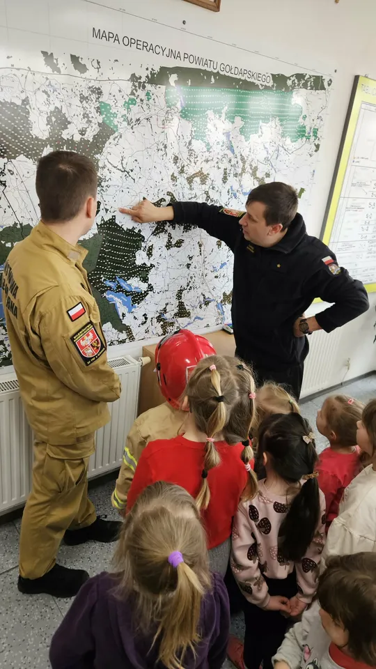 Dużym przeżyciem był przygotowany specjalnie dla najmłodszych pokazowy alarm. Przedszkolaki zobaczyły, jak szybko strażacy przygotowują się do wyjazdu na akcję. Mogły również zobaczyć pomieszczenie, w którym odbierane są zgłoszenia, specjalny telefon alarmowy oraz mapy powiatu pomagające w dokładnym określeniu miejsca zdarzenia.