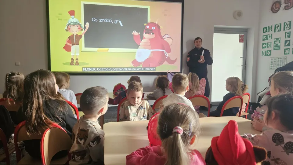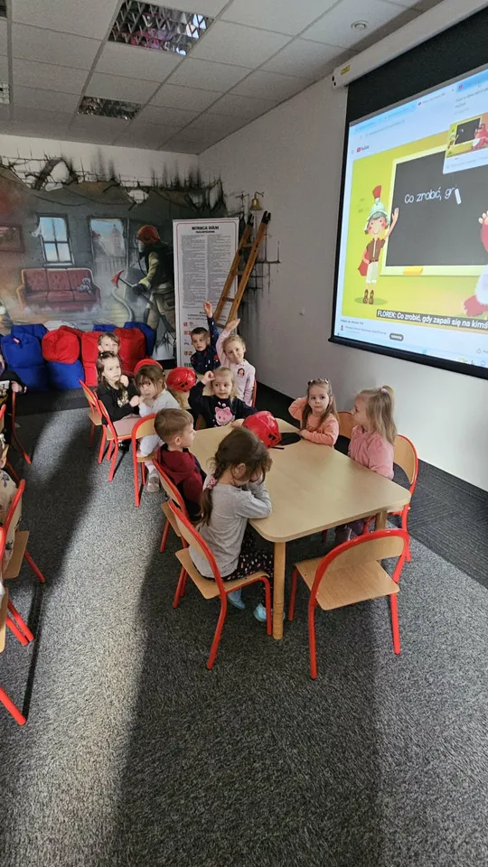 Dzieci swoją przygodę rozpoczęły od zajęć w specjalnej sali edukacyjnej. Tam obejrzały filmy pokazujące jak należy zachować się w sytuacji zagrożenia pożarem zarówno w domu, jak i w szkole. Strażacy w przystępny sposób wyjaśnili najmłodszym, jak prawidłowo zgłosić wypadek oraz jak wezwać pomoc. Przedszkolaki dowiedziały się również, jak reagować, gdy ogień pojawi się w lesie lub na łące.
