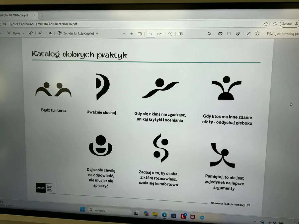 17 kwietnia w klasach 4-8 odbyły się zajęcia w oparciu o materiały przygotowane przez Muzeum Historii Żydów Polskich Polin. Wykorzystano scenariusz do opowiadania „Prezent” Grzegorza Uzdańskiego oraz przeprowadzono w klasach najstarszych „lekcje rozmowy - chewruta”. W analizowanie tekstów włączyli się także nauczyciele i inni dorośli z naszej szkoły. Przypomniany został też wzruszający film „Czika, piesek w getcie”.