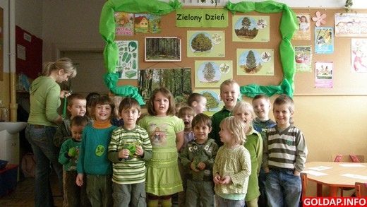 Tego dnia obowiązywał zielony strój. Zielony kolor był motywem przewodnim prac plastycznych, które wykonywano tego dnia. Rozmawiano o zielonych owocach, warzywach oraz o zielonych przedmiotach. Następnie dzieci oglądały prezentację multimedialną na temat lasu i wspólnie zastanawiały się, co trzeba zrobić, żeby lasy przetrwały jak najdłużej, bo przecież lasy produkują tlen, pochłaniają zanieczyszczenia, dają schronienie i pokarm ptakom oraz zwierzętom.