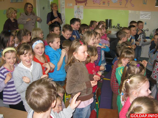 Po sukcesie przedstawienia dla rodziców 3-4latki zaprezentowały w czwartek swoje umiejętności kolegom i koleżankom ze szkoły. Przybyły 5-latki, 6-latki, I i II klasa wraz z wychowawczyniami. Widzowie z uwagą słuchali recytowanych wierszy, a każde z dzieci po swoim występie otrzymywało gromkie brawa. Na koniec wszyscy przybyli odtańczyli razem z małymi artystami "Kaczuszki". Przedstawienie bardzo spodobało się uczniom i 3-4latki zostały nagrodzone brawami.