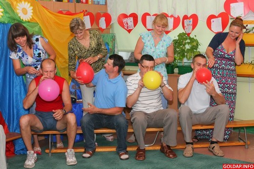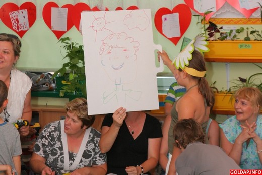 Najukochańsze osoby w życiu maluchów obejrzały przedstawienie wczoraj po południu, nagradzając na koniec młodych aktorów szczerymi brawami. Odbyły się też konkursy dla dorosłych. Mamy podzielone na 3 grupy musiały wspólnie namalować portret dziecka. Nie byłoby nic w tym trudnego, gdyby nie fakt, że miały zakryte oczy. Zadanie wykonały jednak bardzo dobrze, efekty przedstawiamy na zdjęciach. Tatusiowie rywalizowali zaś miedzy sobą, który z nich pierwszy nadmucha dwa balony (mamy musiały je zawiązać).