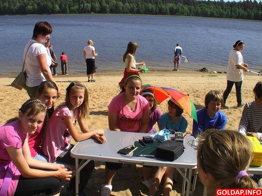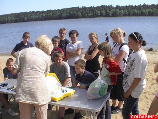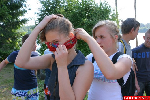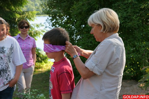 Wraz z nauczycielami przyrody Małgorzatą Wojciechowską-Gutowską i Barbarą Nierwińską oraz gościem z Nadleśnictwa Gołdap Marzanną Konieczny udaliśmy się w pobliże naszego jeziora w celu przeprowadzenia badań. Towarzyszył nam Jeżowóz - laboratorium na kołach. Zaczęliśmy od poznawania przyrody wszystkimi zmysłami poza wzrokiem. Tutaj trzeba było wykazać się dużym zaufaniem do swojego kolegi lub koleżanki, którzy przeprowadzali swoich partnerów na teren badań z zasłoniętymi oczami. To ćwiczenie pomogło nam uzmysłowić, że do poznawania przyrody potrzebne są nam wszystkie zmysły.