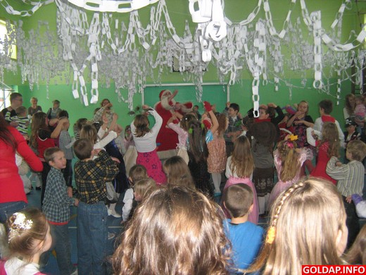 Obecnie mamy do dyspozycji więcej przestrzeni i możemy pozwolić sobie na jeszcze bardziej wyszukane wygibasy. Mamy też niestety więcej pracy przy dekorowaniu takiej powierzchni, jednak starsi uczniowie traktują to zajęcie jako miły wstęp i zapowiedź świetnej zabawy. Tego roku królowała zimowa biel. Własnoręcznie wykonane przez uczniów łańcuchy podkreślały charakter zabawy. Do poprowadzenia imprezy dla maluchów zostali zaproszeni animatorzy Teatru „Forma" z Białegostoku. Wraz z wychowawcami angażowali dzieci do zabawnych konkursów oraz wspólnych wesołych tańców. Profesjonalnie dobrany repertuar muzyczny nie pozwalał małym nóżkom na bezczynność. Do zabawy włączali się także niektórzy rodzice, a nawet dziadkowie. Szkoda tylko, że tak nielicznie. Mamusie i tatusiowie, odwagi! Pokażcie nam w przyszłym roku jak to się robi!