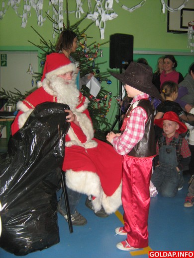 Pod koniec imprezy niespodziewanie pojawił się Mikołaj z wieloma workami prezentów. Czyżby dzieci z naszej szkoły były aż tak grzeczne? Gdy worki zostały opróżnione, Mikołaj udowodnił, że jest jeszcze wyjątkowo dziarski. Odtańczył ze wszystkimi uczestnikami pożegnalny taniec-połamaniec i obiecał odwiedzić nas za rok, pod warunkiem oczywiście, że będziemy grzeczni i pilni w nauce.