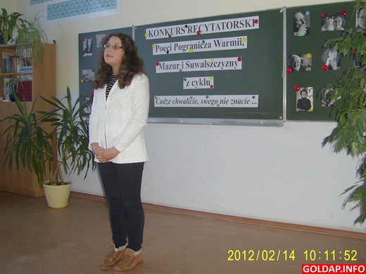 14 lutego w Gimnazjum nr 1 im. Noblistów Polskich w Gołdapi odbyły się eliminacje do IV Powiatowego Konkursu „Cudze chwalicie, swego nie znacie..." Poeci Pogranicza Warmii, Mazur i Suwalszczyzny. Uczniowie nie po raz pierwszy zmierzyli się z recytacją utworów współczesnych twórców lokalnych, takich jak Mirosław Słapik czy Ewa Ewelina oraz poetów Mazur z XIXw. i pierwszych czterech dekad XXw.: Marii Zientary-Malewskiej, Michała Kajki, Karola Sembrzyckiego. Wiersze prezentowano w dwóch kategoriach wiekowych. Pierwszą stanowiła młodzież klas I i II, drugą uczniowie klas III.