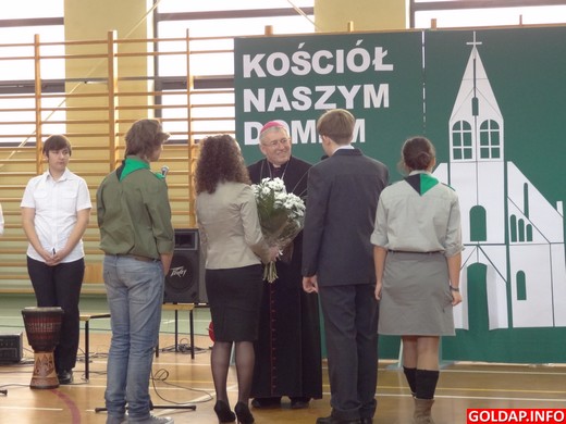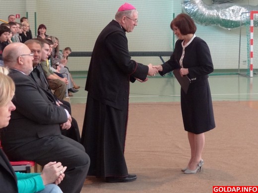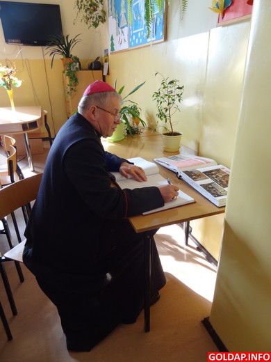 W piątkowy ranek 9 marca wizytę w Gimnazjum nr 1 im. Noblistów Polskich złożył biskup Diecezji Ełckiej ks. Jerzy Mazur. Swoją obecnością zaszczycili szkołę także proboszcz parafii św. Leona i Bonifacego ks. Czesław Król oraz inni księża. Spotkanie miało charakter wizytacji. Dyrektor i uczniowie gimnazjum serdecznie powitali przybyłych gości. Bożena Kalinowska ciepłym słowem i uśmiechem, uczniowie zaś wierszem i piosenką. Krótkie przedstawienie przygotowane przez uczniów i katechetki wprowadziło wszystkich w uroczysty i podniosły nastrój. Biskup, przemawiając do młodzieży oraz później do nauczycieli, podziękował za miłe przyjęcie, udzielił nauki i Bożego błogosławieństwa.