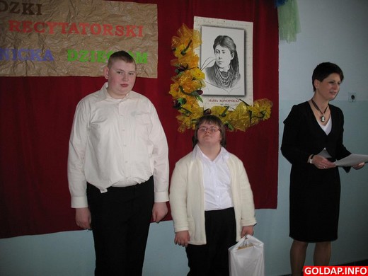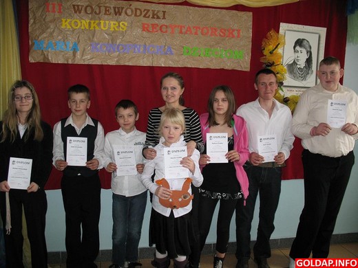 We wtorek, 20 marca w Ośrodku Szkolno-Wychowawczym w Łupkach odbył się III Wojewódzki Konkurs Recytatorski "Maria Konopnicka Dzieciom", skierowany do uczniów z niepełnosprawnością intelektualną w stopniu lekkim, umiarkowanym i znacznym. Uczestniczyli w nim przedstawiciele następujących ośrodków: z Ełku, Mikołajek, Pisza, Szczytna oraz Gołdapi. Naszą placówkę reprezentowali następujący uczniowie: Piotr Grażul, Paweł Sarosiak, Barbara Plewko, Barbara Siosnowska, Rafał Kruwelski, Patryk Krusiński, Kamila Ludke. Sukces odnieśli Barbara Plewko zajmując II miejsce i Paweł Sarosiak, który otrzymał wyróżnienie. Pozostali uczestnicy otrzymali słodki upominek.