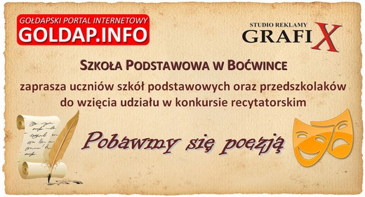 Szkoła Podstawowa w Boćwince zaprasza uczniów szkół podstawowych oraz przedszkolaków do wzięcia udziału w konkursie recytatorskim „Pobawmy się poezją". Odbędzie się on w drugiej połowie maja. Osoby chętne powinny zgłosić swój udział do 20 kwietnia.