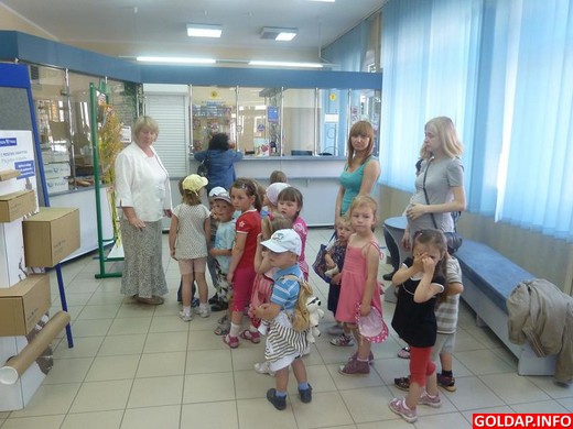 Kolejną atrakcją tego dnia była wizyta przedszkolaków w placówce Poczty Polskiej. Dzieci z zaciekawieniem słuchały informacji o pracy na poczcie. Dowiedziały się, że można tam nie tylko wysłać list czy paczkę, ale również zapłacić rachunki oraz załatwić wiele innych spraw. W podziękowaniu za miłe przyjęcie i upominki dzieci podarowały pracownikom poczty laurkę i kwiaty.