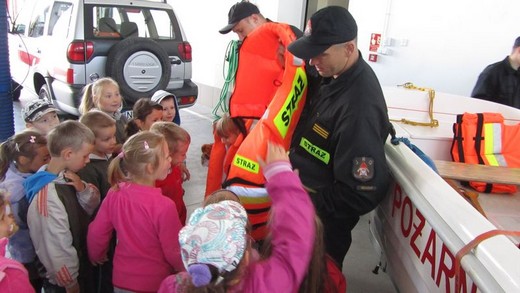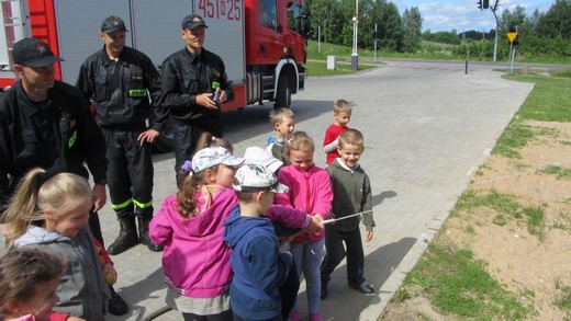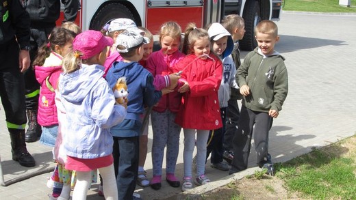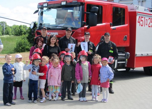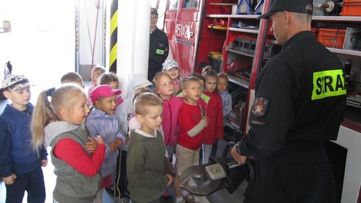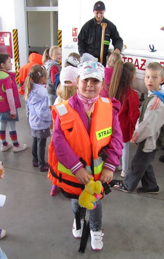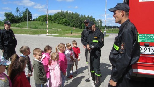 6 czerwca pięciolatki „A" ze Szkoły Podstawowej nr 3 pod opieką wychowawczyni udały się do Państwowej Straży Pożarnej w Gołdapi. Celem wizyty było pogłębienie wiadomości o pracy strażaków. Dzieci zostały bardzo serdecznie przywitane przez panów strażaków. Na początku przedszkolaki mogły nie tylko wsiadać do wozu strażackiego, ale również przymierzać kaski i kamizelki ratunkowe. Obejrzały sprzęt służący do gaszenia pożarów, nożyce rozcinające karoserię samochodową, motorówkę używaną w akcjach wodnych i strój nurka służący do pracy pod wodą. Największą atrakcją była przejażdżka zwyżką. Na koniec wizyty zrobiliśmy pamiątkowe zdjęcia oraz podziękowaliśmy za miłe spotkanie i uzyskane wiadomości, wręczając laurki i obrazki przygotowane przez dzieci. Wizyta była pełna wrażeń i bardzo się maluchom podobała.