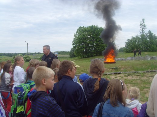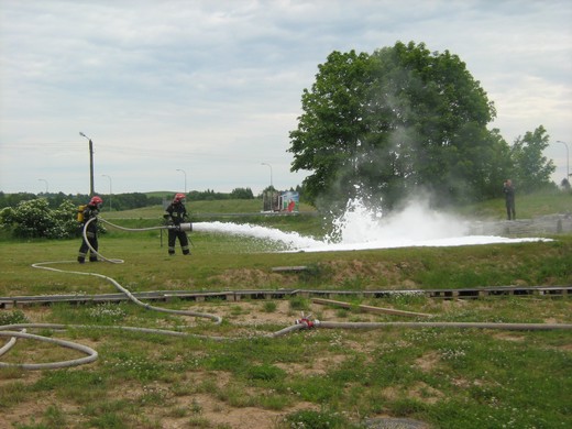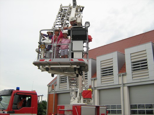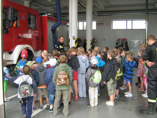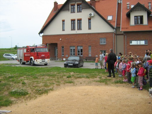 Niemal każdy mały chłopiec marzy, by w przyszłości zostać strażakiem lub policjantem. Dziś była okazja przymierzyć prawdziwy hełm strażacki i bliżej zapoznać się z tym trudnym i niestety niebezpiecznym zawodem. Dzieci po raz pierwszy gościły w nowej Państwowej Straży Pożarnej w Gołdapi. Specjalnie dla nas strażacy zasymulowali pożar. Wszyscy przypomnieliśmy telefony alarmowe. Po zgłoszeniu pożaru z komórki na 998, dyspozytor wydał przez głośnik komendę i rozpoczęto akcję gaśniczą. Zawyła syrena wozu strażackiego, błyskawicznie rozwinięto węże i ugaszono ogień pianą przypominającą bitą śmietanę. Wszyscy z zapartym tchem obserwowaliśmy, jak jeden ze strażaków w mgnieniu oka za pomocą specjalnej drabiny przedostał się na wysoką ścianę do ćwiczeń. Później sami mogliśmy doświadczyć wrażeń na wysokości. Na podnośniku w kaskach ochronnych dzieci piszczały z radości. Cieszymy się, że możemy spać spokojnie, bo nasi dzielni strażacy czuwają nad naszym bezpieczeństwem. Dziękujemy.