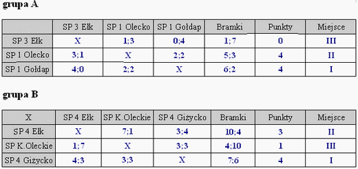 W ubiegłym tygodniu na stadionie miejskim w Gołdapi odbyły się Mistrzostwa Rejonu VI Szkół Podstawowych w Mini Piłce Nożnej Chłopców. Wzięło w nich udział 7 zespołów: SP1 Gołdap, SP1 Olecko, SP Kowale Oleckie, SP3 Ełk, SP4 Ełk, SP4 Giżycko i SP Wydminy. W wyniku losowania, w którym udział wzięli opiekunowie (trenerzy) poszczególnych drużyn, wyłonione zostały dwie grupy. Zespoły zagrały w nich systemem każdy z każdym. Po dwie najlepsze z grupy zmierzyły się w półfinałach. W turnieju zwyciężyła drużyna SP1 Gołdap. Najlepszym zawodnikiem został Adrian Szklanko z Ełku. Mecze sędziowali Łukasz Tarasiewicz i Zbigniew Konobrocki.