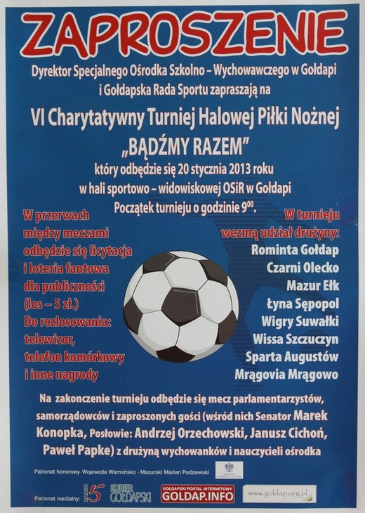 Dyrektor Specjalnego Ośrodka Szkolno-Wychowawczego i Gołdapska rada Sportu zapraszają na VI Charytatywny Turniej Halowej Piłki Nożnej „Bądźmy razem". Odbędzie się on 20 stycznia w hali Kompleksu Sportowo-Rekreacyjnego. Początek o godzinie 9.00. Szczegóły na plakacie.
