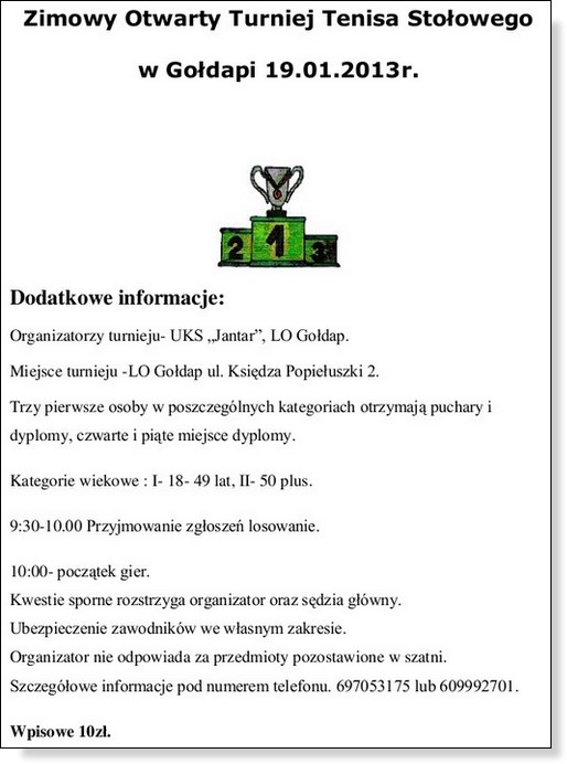 UKS „Jantar" oraz Liceum Ogólnokształcące w Gołdapi zapraszają na Zimowy Otwarty Turniej Tenisa Stołowego. Odbędzie się on w sobotę, 19 stycznia w sali gimnastycznej LO. Zapisy chętnych w dniu zawodów, wpisowe wynosi 10zł. Szczegóły na plakacie.