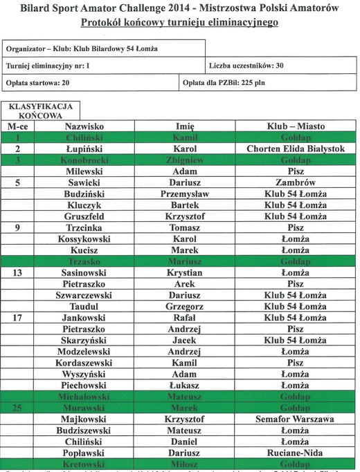 Przedstawiamy państwu wyniki z ostatnich zawodów tj. I Eliminacji do Mistrzostw Polski Amatorów, które odbył się w Klubie Bilardowym 54 w Łomży.