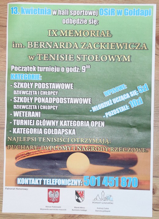 GOŁDAP. Jutro w hali Kompleksu Sportowo-Rekreacyjnego odbędzie się IX Memoriał im. Bernarda Zackiewicza w Tenisie Stołowym. Początek gier o godzinie 9.00. Na najlepszych czekają puchary, dyplomy i nagrody rzeczowe. Wpisowe wynosi: 5zł ucząca się młodzież, 10zł pozostali. Więcej informacji pod numerem 501-451-870.