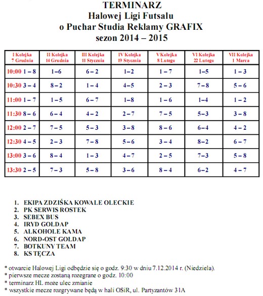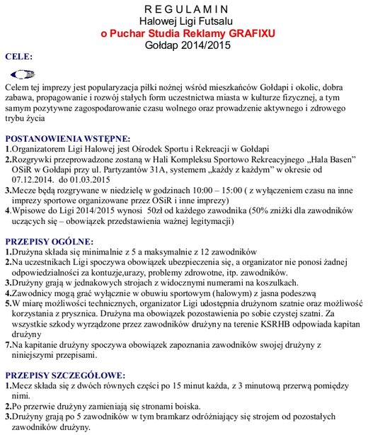 GOŁDAP. Przed nami kolejna edycja halowej ligi futsalu, organizowanej przez Ośrodek Sportu i Rekreacji w Gołdapi. Tym razem zawodnicy powalczą o Puchar Studia Reklamy GRAFIX w Gołdapi. W rozgrywkach weźmie udział 8 drużyn z: Kowali Oleckich, Botkun i Gołdapi. W tegorocznej edycji podczas jednego dnia rozgrywanych będzie osiem spotkań. Podobnie jak w zeszłych latach tak i teraz organizatorzy liczą na duże zainteresowanie rozgrywkami, które odbywać się będą w hali Kompleksu Sportowo-Rekreacyjnego.