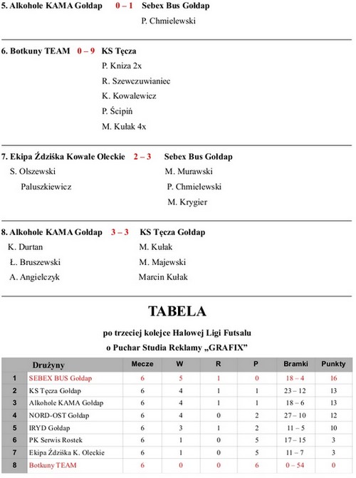 Nastąpiła zmiana na pozycji lidera. Została nim drużyna Sebex Bus Gołdap. Na drugie miejsce awansowała drużyna KS Tęcza, która z kolejki na kolejkę spisuje się coraz lepiej. Do formy wraca również ekipa Nord-Ost Gołdap, która w dwóch wczorajszych meczach strzeliła 19 bramek, pewnie wygrywając swoje spotkania. Tabelę zamyka nowicjusz w lidze – Botkuny team.