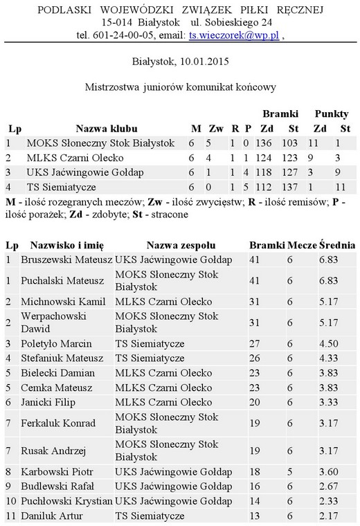 SIEMIATYCZE. Zawodnicy UKS Jaćwingowie Gołdap zdobyli w sobotę brązowy medal w kategorii junior w Mistrzostwach Województwa Podlaskiego w Piłce Ręcznej. Przegrali ze starszymi i znacznie bardziej doświadczonymi zawodnikami z Białegostoku i Olecka. Dodatkowo Mateusz Bruszewski został królem strzelców tych rozgrywek.