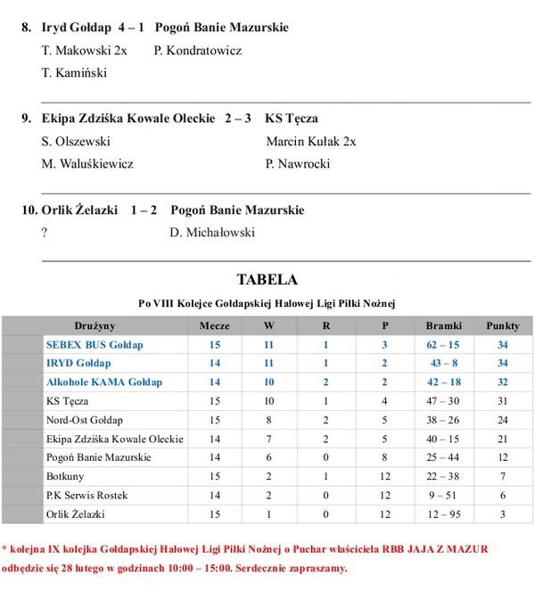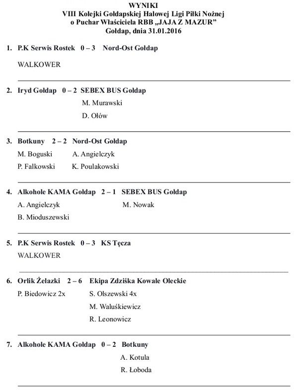 GOŁDAP. 7 lutego w hali OSiR została rozegrana VIII kolejka Gołdapskiej Halowej Ligi Piłki Nożnej o Puchar właściciela RBB Jaja z Mazur. Z zaplanowanych 10 spotkań rozegrano 8 bowiem na swoje mecze nie stawiła się drużyna P.K Serwis Rostek oddając je walkowerem. Podczas VIII kolejki doszło do największej dotychczas niespodzianki. Jeden z faworytów do wygranej w lidze, zespół Alkohole KAMA Gołdap uległ niżej notowanej drużynie z Botkun 0:2.