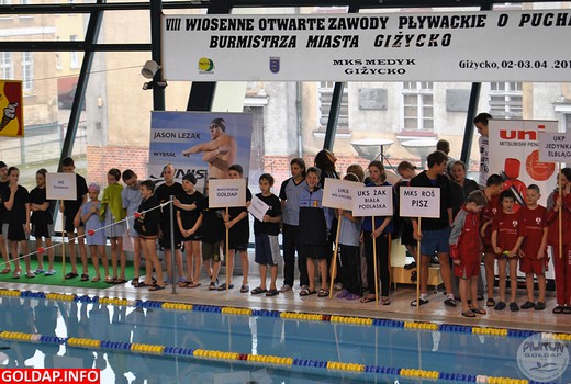 2 złote, 5 srebrnych i 4 brązowe medale - to dorobek gołdapskich pływaków podczas VIII Wiosennych Otwartych Zawodów Pływackich o Puchar Burmistrza Giżycka, które odbyły się w dniach 2-3 kwietnia na pływalni w Giżycku. W zawodach wzięło udział 26 klubów z całej Polski, wśród nich również niedawno powstały MUKS „Piorun" Gołdap. Reprezentowało go 15 pływaków. Gołdapskie „Pioruny" osiągnęły bardzo dobre wyniki. Rewelacyjnie spisał się 9-letni zawodnik Marcin Przyborowski, który podczas całej imprezy na cztery starty zdobył aż trzy medale: jeden złoty na 100m stylem dowolnym (1:34,35) i dwa srebrne - 50m stylem dowolnym (0:41,71) i 50m stylem grzbietowym (0:48,78). Również Dawid Sobolewski udowodnił, że ciężka praca zawsze przynosi sukcesy i dzięki niej zdobył dwa medale: złoty na dystansie 50m stylem dowolnym (0:39,95) i srebrny w wyścigu 100m stylem dowolnym (1:34,53). Dawid w rankingu najlepszych zawodników w kat. 9 lat i mł. uplasował się na IV miejscu z niewielką stratą, bo tylko 7 pkt. do zwycięzcy pucharu w ogólnej punktacji. Dawid i Marcin dowiedli, że są najlepsi w swojej kategorii w stylu dowolnym na 50m i nie dając szans rywalom zajęli w tym wyścigu kolejno I i II miejsce. Na wielkie uznanie zasługuje Kacper Taudul, który jako najmłodszy zawodnik w swojej kategorii zajął II miejsce na dystansie 100m stylem klasycznym (1:54,57). Świetnie spisały się również Barbara Mejcz (zdobyła srebrny medal w stylu klasycznym na długości 50m (0:48,68)) oraz Julia Zduniewicz (zajęła II miejsce na dystansie 100m w stylu klasycznym (1:55,57)). Na podium stanęli również: Mateusz Sztuk (III miejsce w wyścigu 50m stylem grzbietowym (0:38,45)), Igor Becz (brązowy medal na dystansie 50m w stylu klasycznym (0:40,22)) i Andrzej Staniaszek, który odważnie zmierzył się z wyścigiem 100m stylem motylkowym (III miejsce z czasem 1:34,31).
