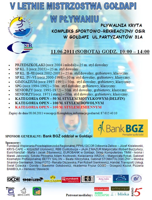 Mistrzostwa odbędą się 11 czerwca na pływalni przy ul. Partyzantów 31A w Gołdapi. Początek zawodów o godz. 10.00, rozgrzewka pół godziny wcześniej.