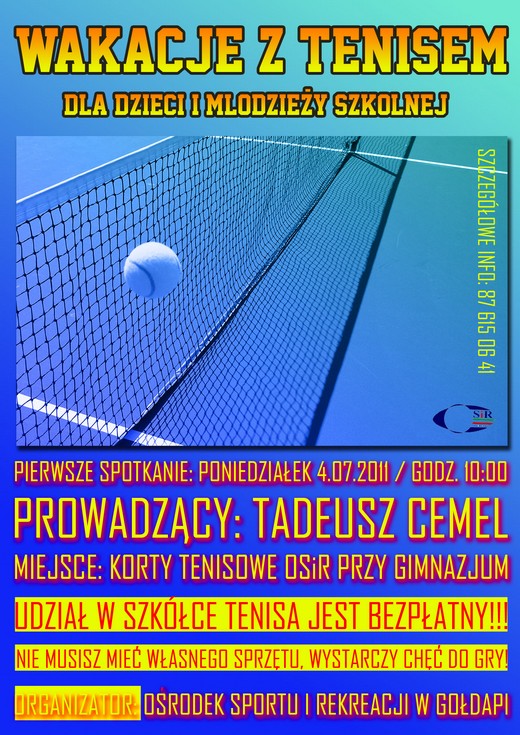 Ośrodek Sportu i Rekreacji w Gołdapi zaprasza dzieci i młodzież do wakacyjnej szkółki tenisa ziemnego. Zajęcia, które poprowadzi Tadeusz Cemel, będą bezpłatne. Spotkanie organizacyjne odbędzie się 4 lipca o godzinie 10.00 na kortach przy gimnazjum.
