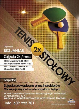 Uczniowski Klub Sportowy „Jantar" zaprasza chętnych na zajęcia z tenisa stołowego. Będą one się odbywały w hali sportowej w Kompleksie Sportowo-Rekreacyjnym dwa razy w miesiącu. Zajęcia są bezpłatne. Dodatkowe informacje można uzyskać pod numerem telefonu 609-992-701.