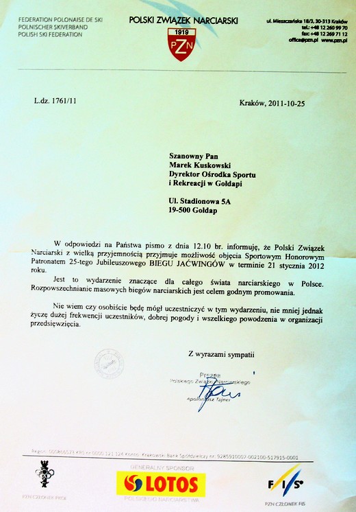 Dyrektor OSiR Marek Kuskowski otrzymał wczoraj pisemne potwierdzenie tego faktu. Prezes związku Apoloniusz Tajner napisał m.in., że Bieg Jaćwingów jest znaczącym wydarzeniem dla całego świata narciarskiego.
