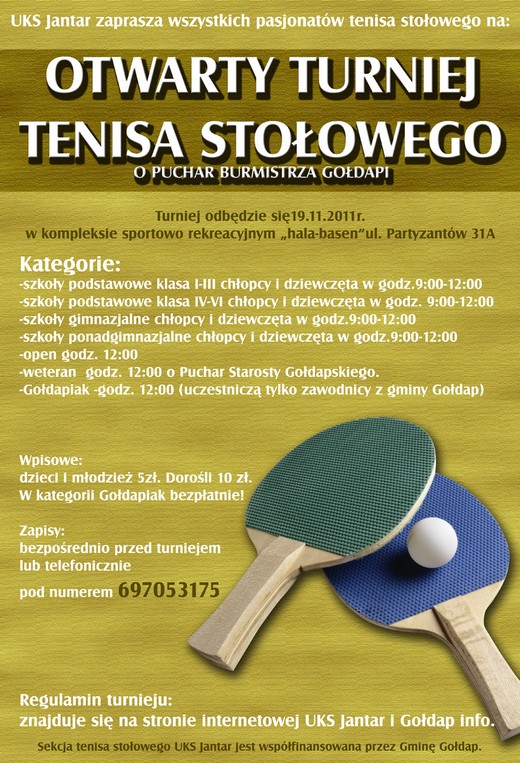 19 listopada w hali Kompleksu Sportowo-Rekreacyjnego odbędzie się Otwarty turniej tenisa stołowego o puchar burmistrza Gołdapi i starosty gołdapskiego. Początek zawodów o godzinie 9.00. Zapisy chętnych bezpośrednio przed turniejem lub telefonicznie pod numerem 697-053-175. Szczegóły w regulaminie.