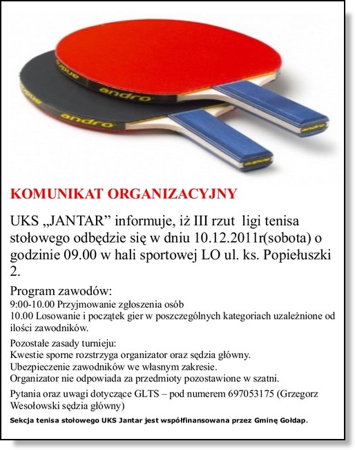 10 grudnia w sali gimnastycznej LO odbędzie się III kolejka ligi tenisa stołowego, organizowanej przez UKS „Jantar". Rejestracja uczestników w dniu zawodów w godzinach 9.00-10.00. Pierwsze mecze o godzinie 10.00.