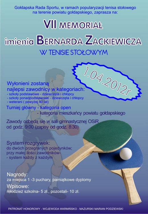 Gołdapska Rada Sportu zaprasza na VII Memoriał im. Bernarda Zackiewicza w tenisie stołowym. Zawody odbędą się w  najbliższą niedzielę  w hali OSiR przy ul. Partyzantów. Zapisy w dniu zawodów od godziny 8.30, pierwsze mecze o 9.00. Szczegóły na plakacie.
