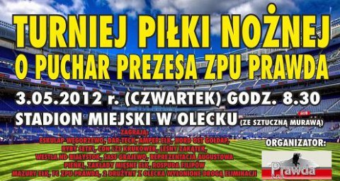 Dwie gołdapskie drużyny: Nord Ost i Leśny Zakątek zagrają 3 maja na stadionie miejskim w Olecku w turnieju o puchar prezesa ZPU „Prawda". Łącznie rywalizować będzie 17 zespołów, m.in. z Olecka, Węgozrewa, Białegostoku i Ełku. Gołdapianom życzymy powodzenia.