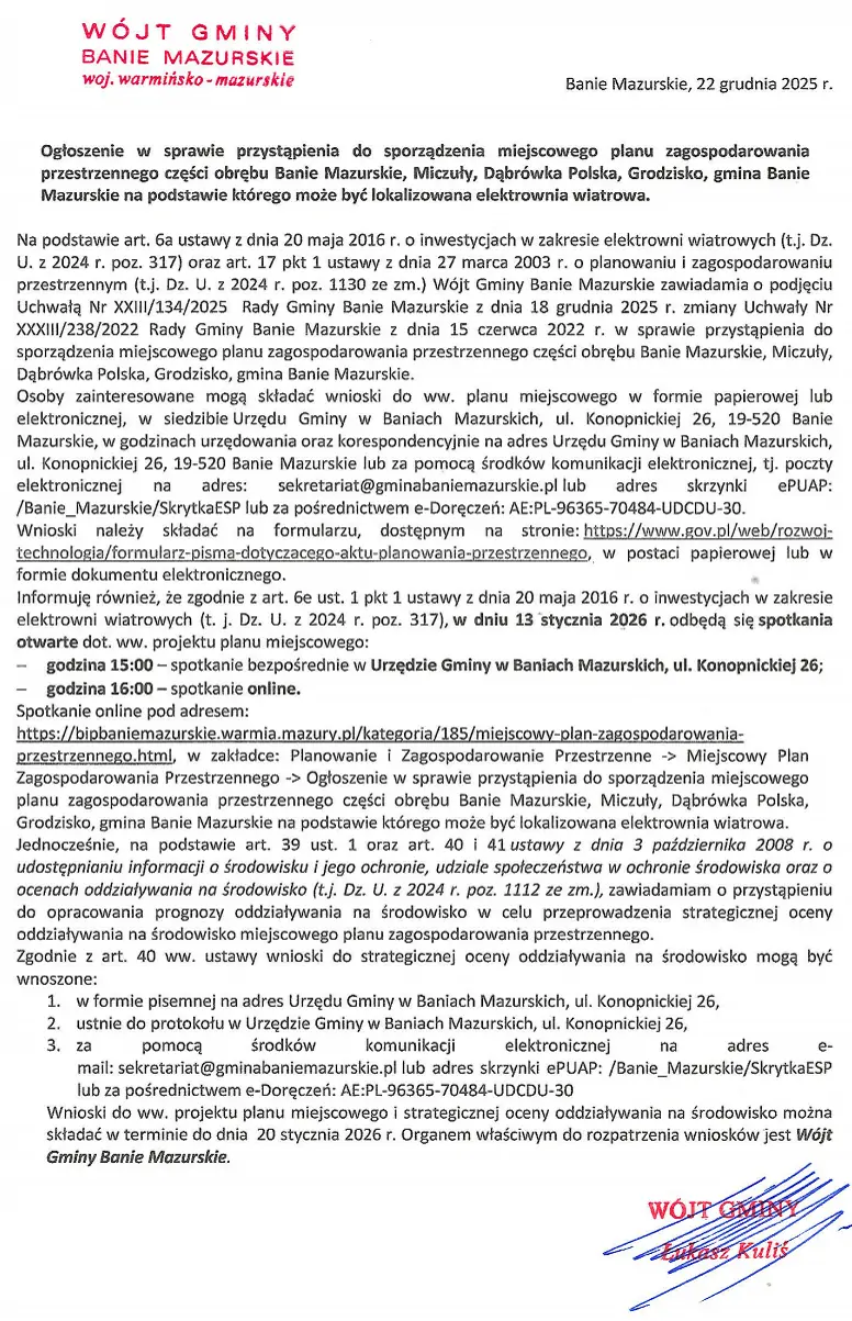 Ogłoszenie w sprawie przystąpienia do sporządzenia miejscowego planu zagospodarowania przestrzennego części obrębu Banie Mazurskie, Miczuły, Dąbrówka Polska, Grodzisko, gmina Banie Mazurskie na podstawie którego może być lokalizowana elektrownia wiatrowa.