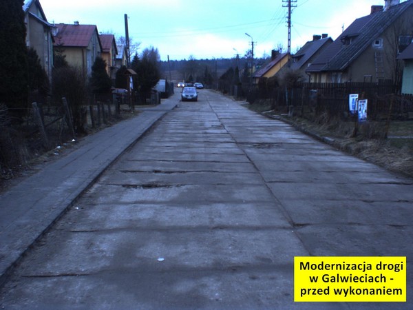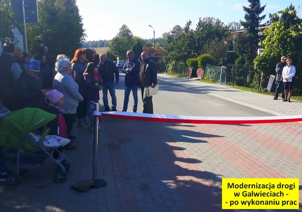 2. Przebudowa drogi w Galwieciach. Droga łącząca się z drogą wojewódzką nr 651 posiadała nawierzchnię z drogowych płyt betonowych. Płyty te usunięto i wykonano nawierzchnię bitumiczną. Ustawiono dwa znaki drogowe zasilane solarnie i wyznaczono zatokę autobusową. Koszt zadania: 634 967 zł. Dofinansowanie w wysokości 317 483 zł pozyskano z Programu Rozwoju Gminnej i Powiatowej Infrastruktury Drogowej.