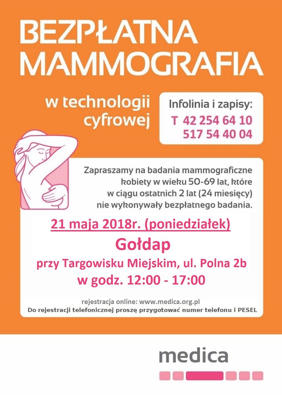 W ramach współpracy ze spółką Medica, realizującą na terenie naszego województwa program badań mammograficznych zachęcamy do skorzystania z badania profilaktycznego. Kolejna tura badań w Gołdapi będzie mieć miejsce 21 maja 2018r. na targowisku miejskim w godzinach 12:00 - 17:00.